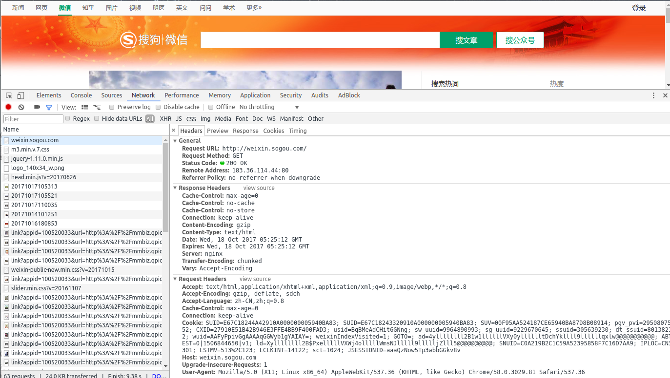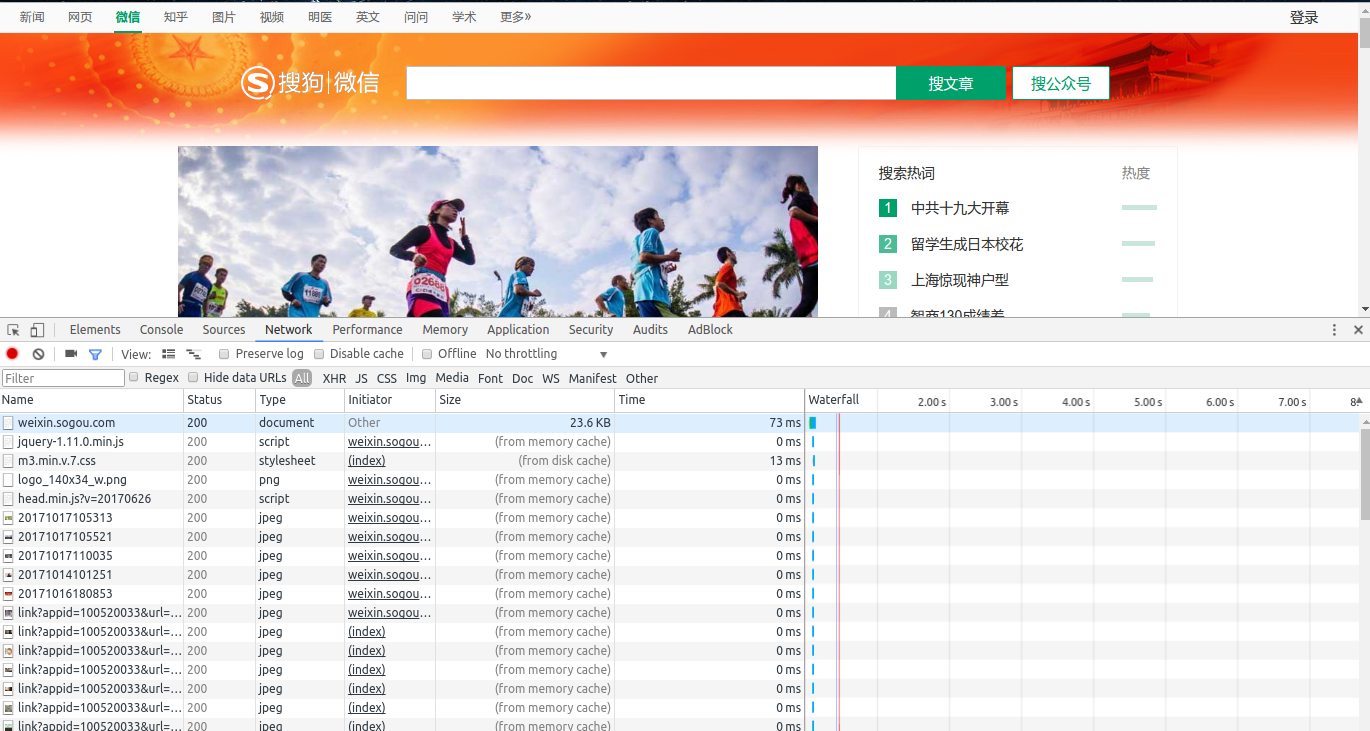 打开 Chrome 浏览器,右键点击检查,或按下快捷键 F12 即可打开浏览器的开发者工具,我们在这里访问搜狗微信搜索:http://weixin.sogou.com/ ,输入该 URL,敲击回车访问这个页面,观察一下在这个过程中发生了怎样的网络请求,这时我们可以看到在 Network 页面的下方出现了一个个的条目,那么这一个条目就代表一次发送 Request 和接收 Response 的过程,如图所示: